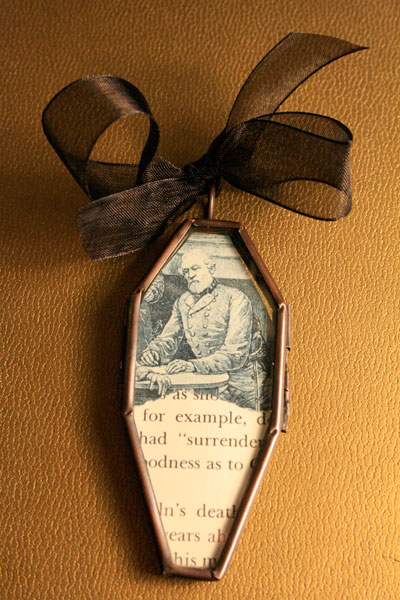 civil war, coffin-shaped, picture-frame pendant, with collage: text from vintage history book pages, tied with black ribbon.