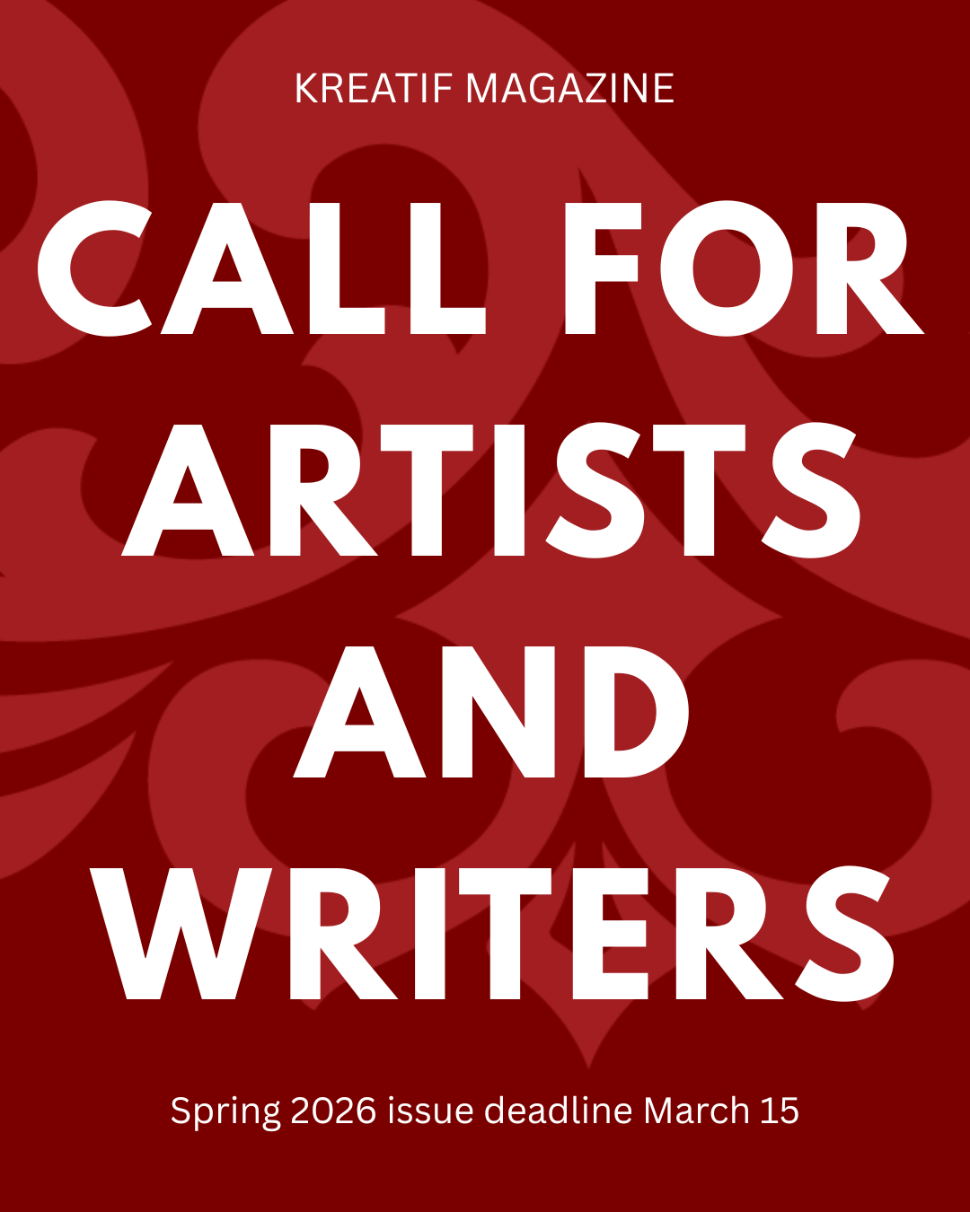 open call for artists and writers for the next issue of kreatif magazine is live now until march 15. you can submit through the website, and on [clmp], artConnect and duotrope.